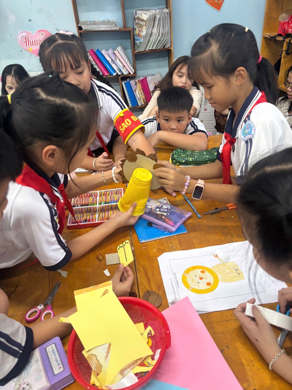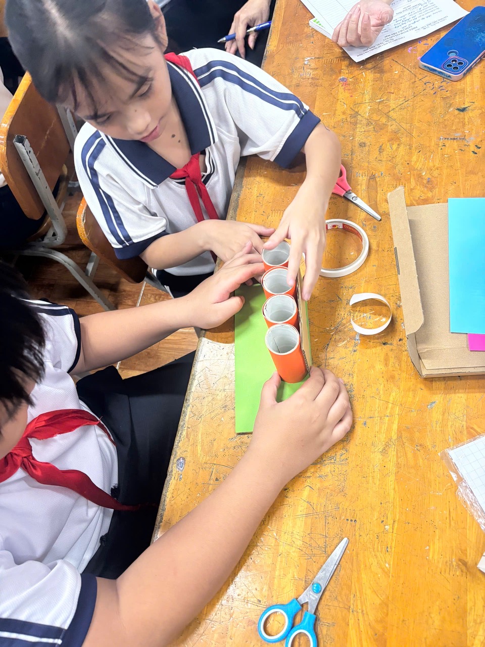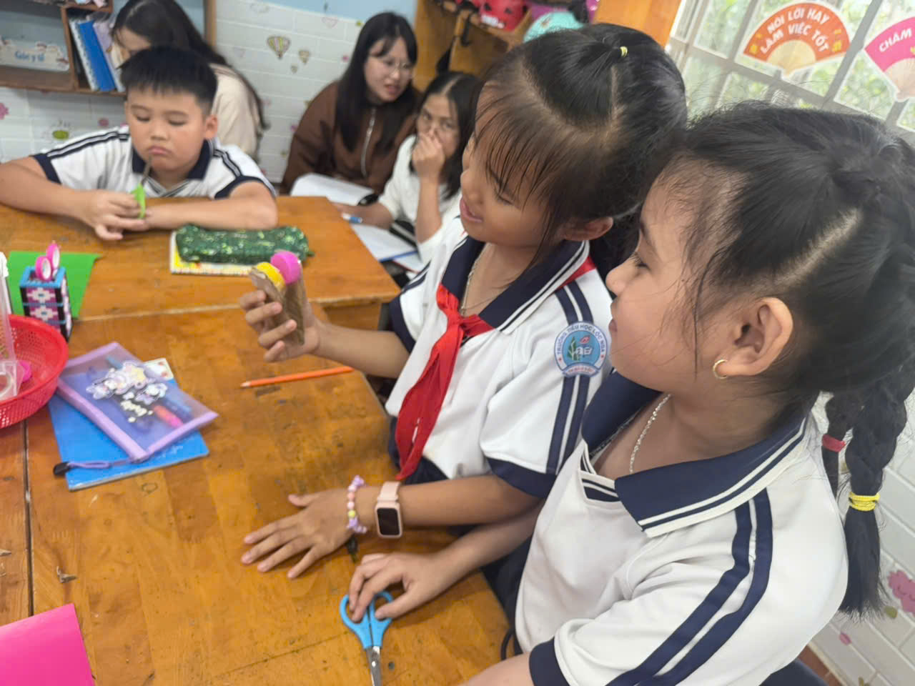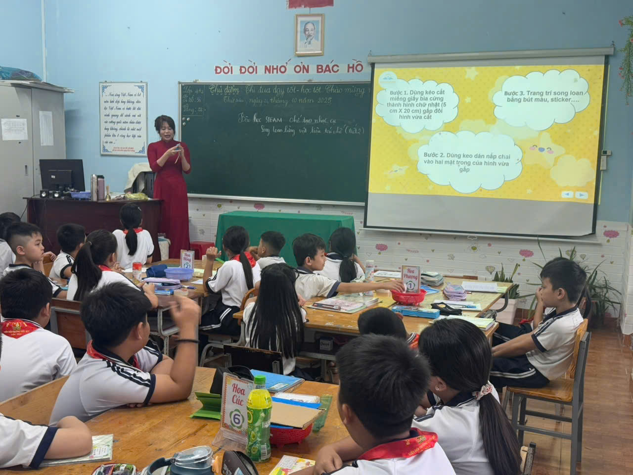 Ở môn Âm nhạc, cô Trần Thị Thoáng lại mang đến cho các em một không gian nghệ thuật đầy âm thanh qua bài học “Thực hành làm nhạc cụ song loan bằng vật liệu tái chế”. Dưới sự hướng dẫn tận tình của cô, những chiếc song loan từ nắp chai đã vang lên rộn ràng, tạo nên giai điệu vui tươi, độc đáo do chính các em tự tay làm ra.