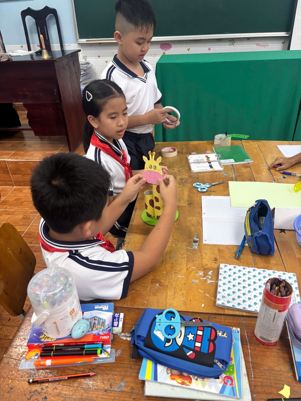 Ở môn Mỹ thuật, cô Chu Phương Thùy đã mang đến bài học “Tạo hình động vật từ vật liệu đã qua sử dụng”. Với sự khéo léo và óc sáng tạo, các em học sinh lớp 4A2 đã biến những vật liệu tưởng chừng bỏ đi như chai nhựa, bìa cứng, nắp chai… thành những chú voi, chú sư tử , chú mèo ngộ nghĩnh đầy màu sắc. Bài học không chỉ giúp học sinh rèn luyện kỹ năng tạo hình mà còn giáo dục ý thức bảo vệ môi trường và tái chế rác thải một cách ý nghĩa.